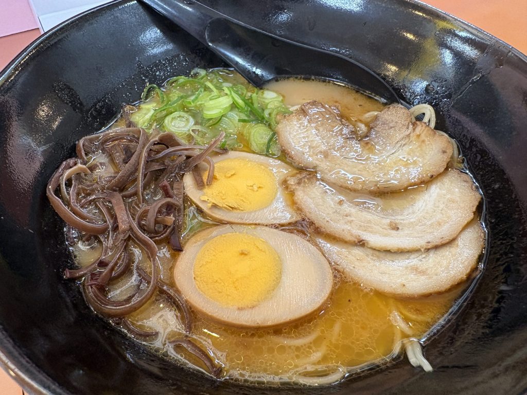 豚骨に中太麺、マー油がかかったラーメンは、チャーシューやキクラゲなど具材も豪華でとてもおいしかった。