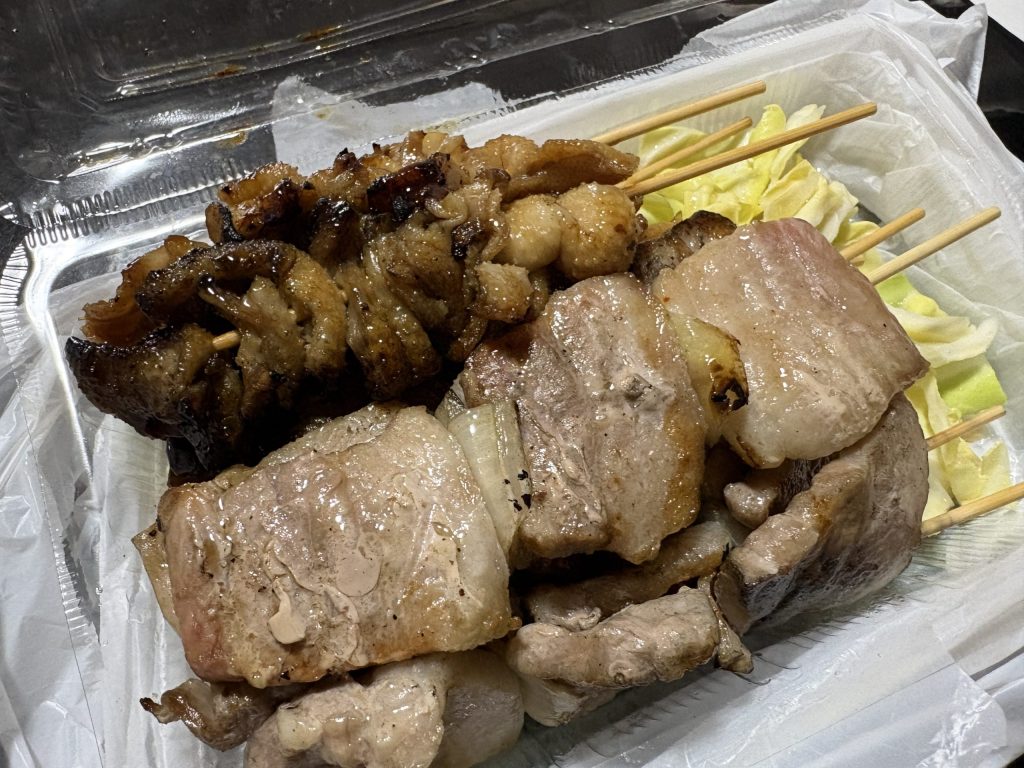 さらに海の方まで降りて、評判の焼き鳥店「かめまん」で焼き鳥を持ち帰り。